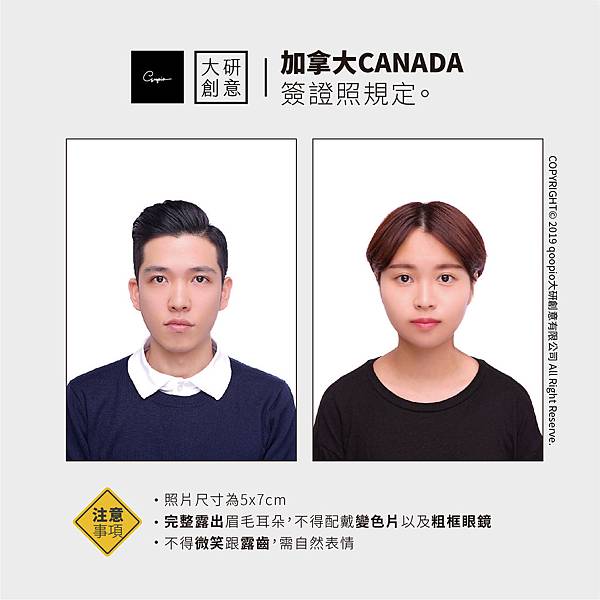 不能微笑這個真的是史上最特別的規定沒有之二了,因為拍攝時我們通常都會請客人拍一張刻意笑大一點的照片做比較跟選擇,所以如果要拍攝加拿大護照照片的客人要特別注意喔~